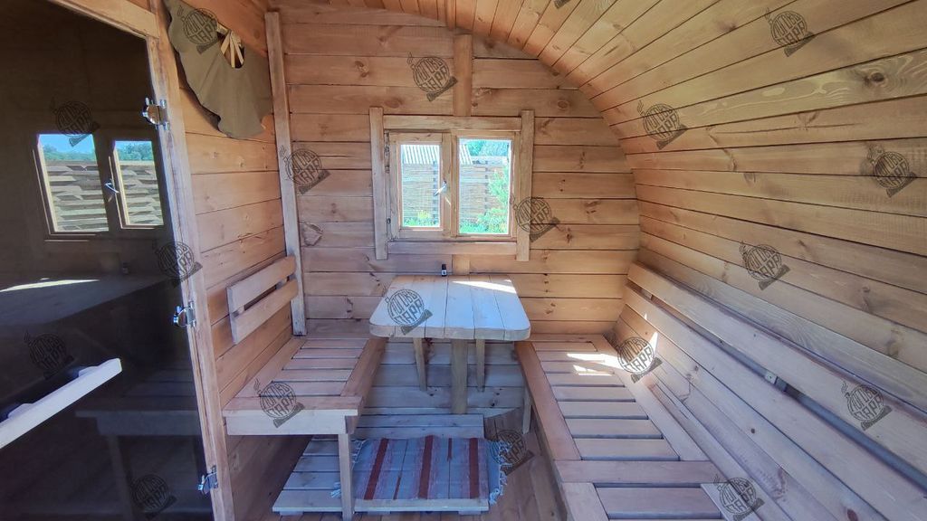 Это компактная и эстетичная баня размерами 4x2.2 метра, выполненная из ароматной древесины ели. Её главная особенность — панорамное окно в форме полумесяца, которое наполняет пространство мягким светом и создает ощущение единения с природой.