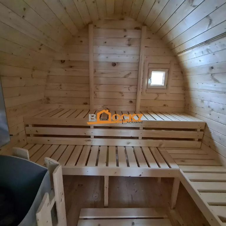Баня имеет конусовидное сечение и добавляет вашему участку свою изюминку, смотря на такую баню можно пофантазировать и перенестись в эпоху викингов-завоевателей, прикупив себе тематические банные шапки.