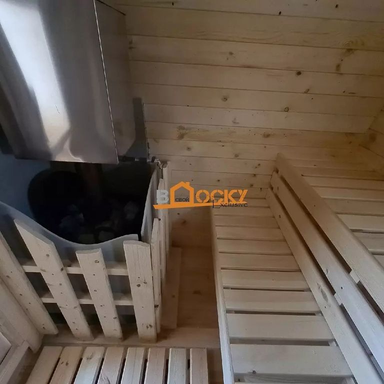Баня сохраняет в себе все свойства бань-бочек: 1. Быстрый прогрев 2. Экономичный расход дров 3. Надежность конструкции 4.Возможность делать вход с торца и сбоку