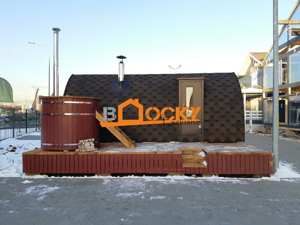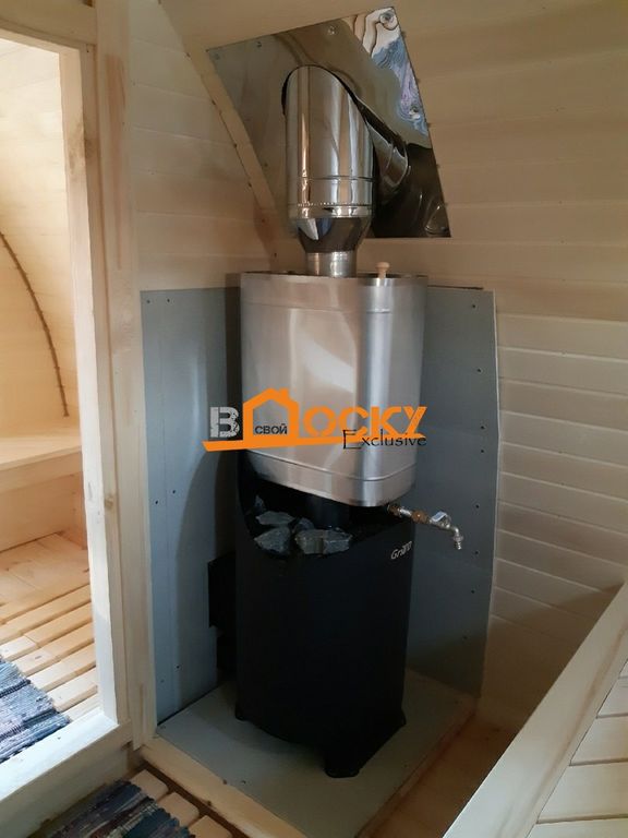 Баня сохраняет в себе все свойства бань-бочек: 1. Быстрый прогрев 2. Экономичный расход дров 3. Надежность конструкции 4.Возможность делать вход с торца и сбоку