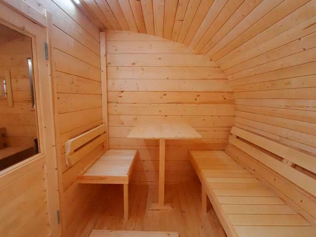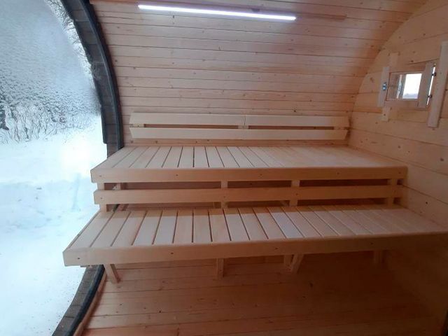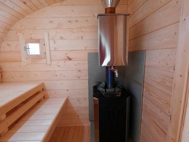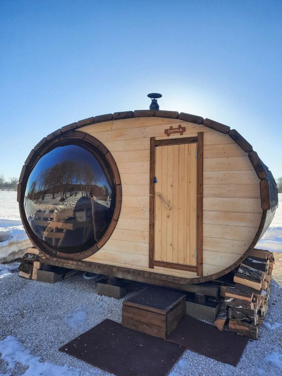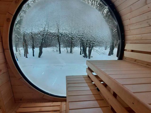 За счет большого окна небольшое пространство бани-бочки увеличивается, и вы уже не скованы в 4х стенах, а находитесь в безграничном пространстве.