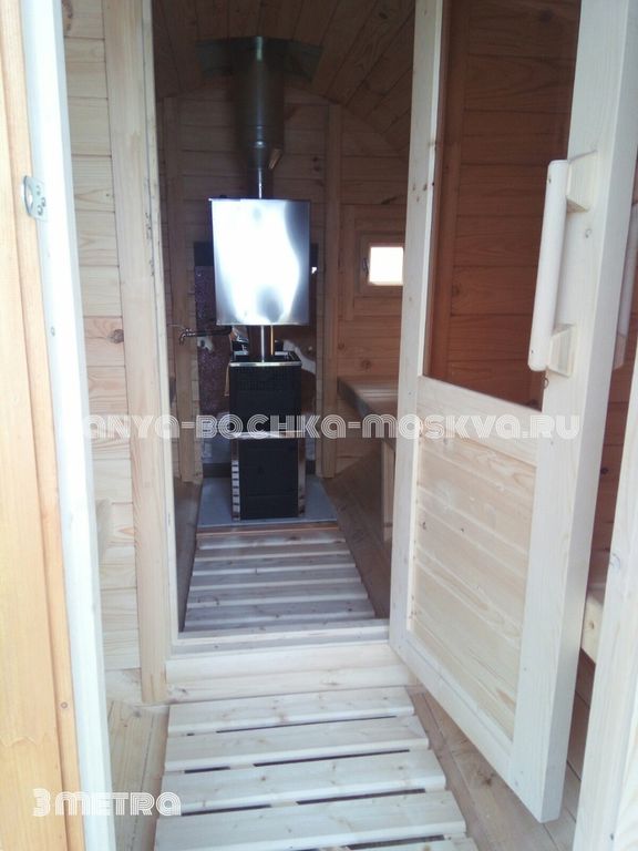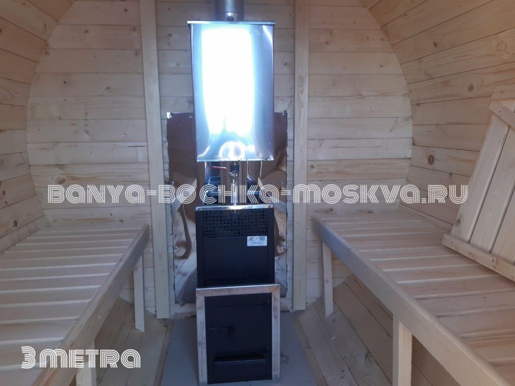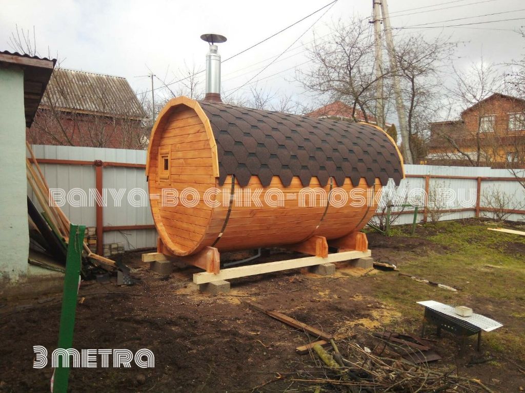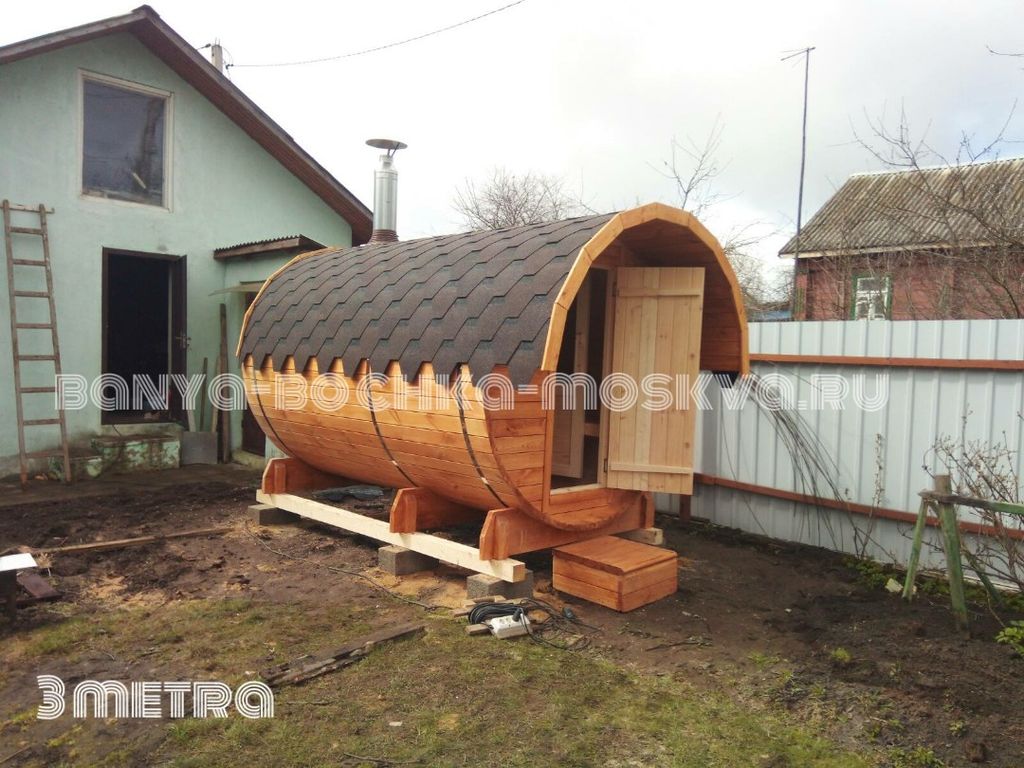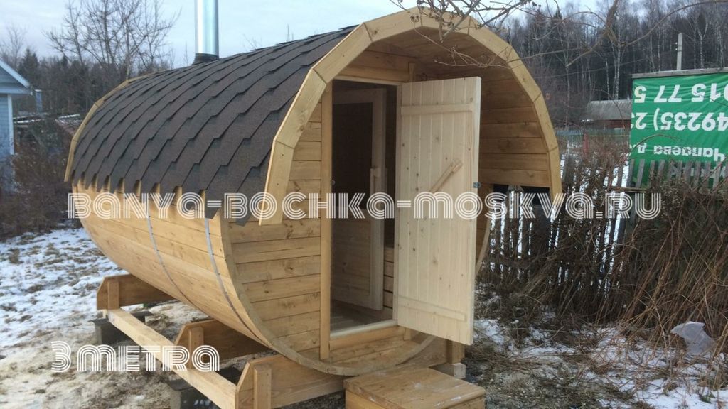 - Баня-бочка 3 метра— максимально доступная и красивая баня-бочка для отдыха на собственном участке.