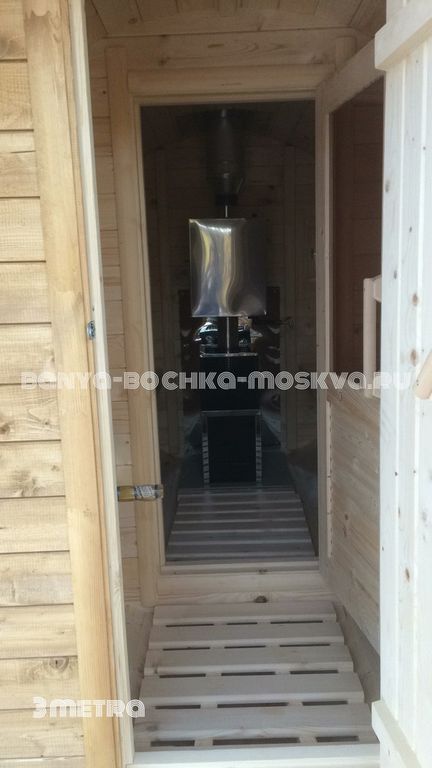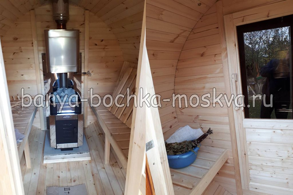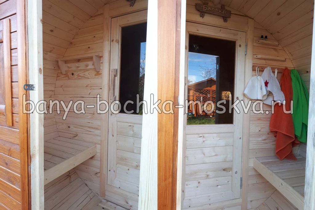 - Баня-бочка имеет два отделения: парилку и небольшой предбанник. Является отличным вариантом для небольшого садового или дачного участка. Идеально подходит для использования в любое время года.