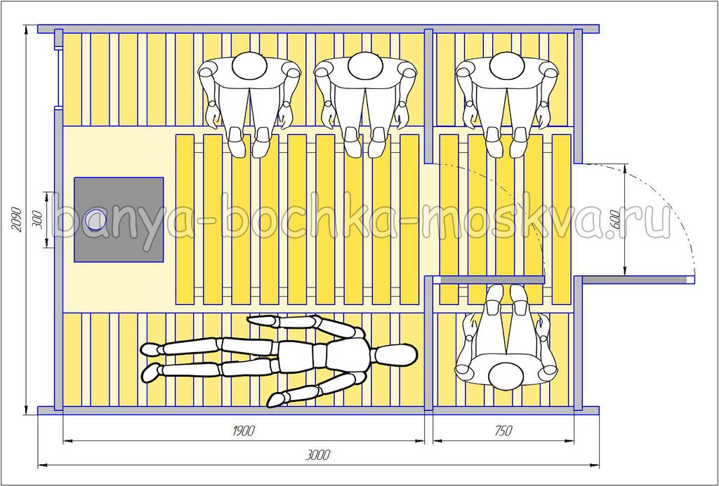 - Вместимость парного отделения до 4 человек, вместимость предбанника до 2 человек. Занимает площадь участка 6 кв.м.