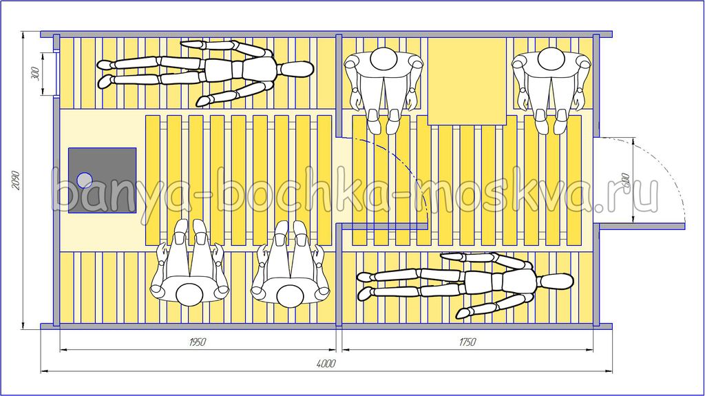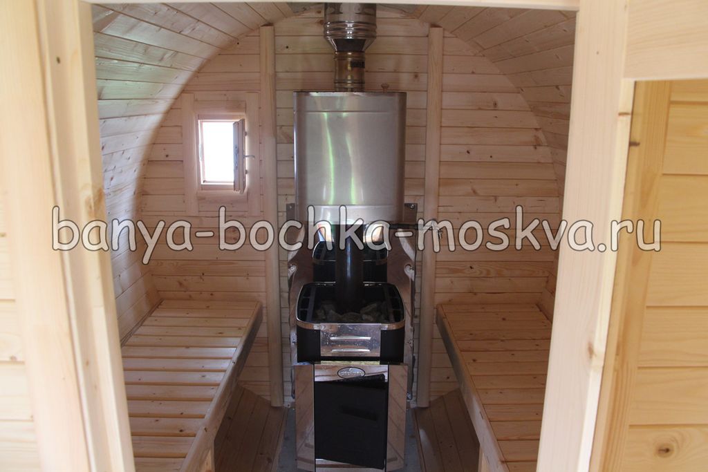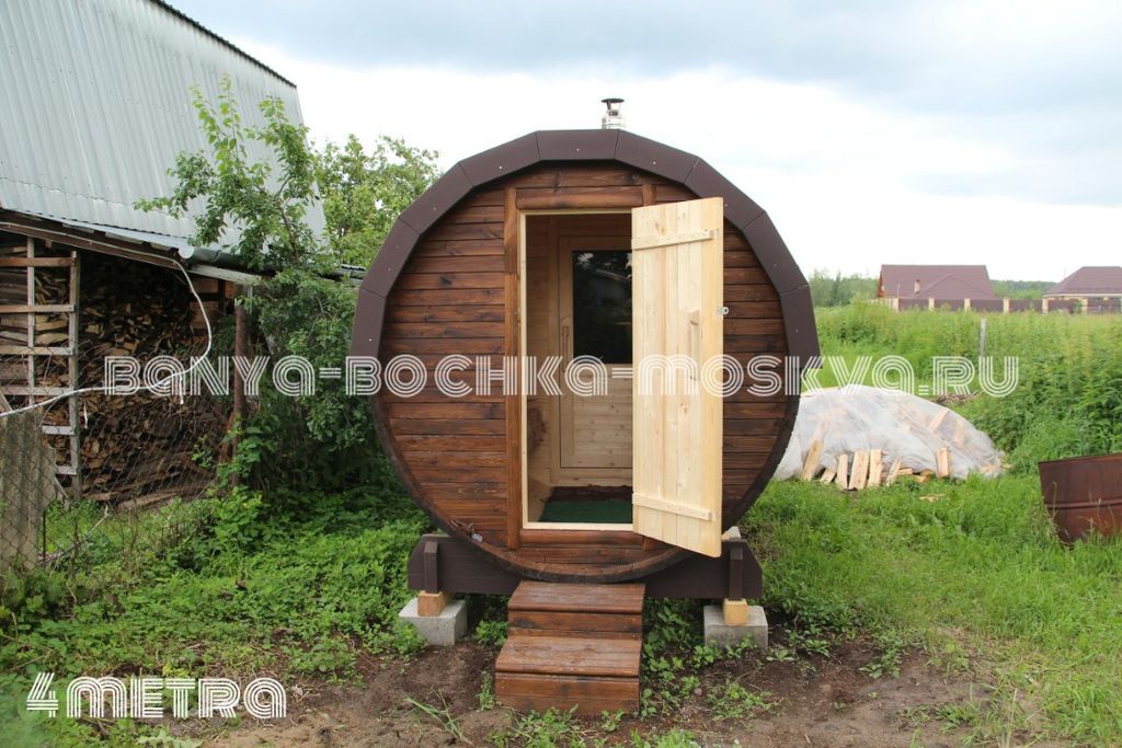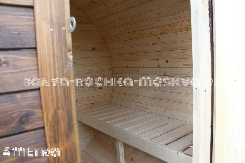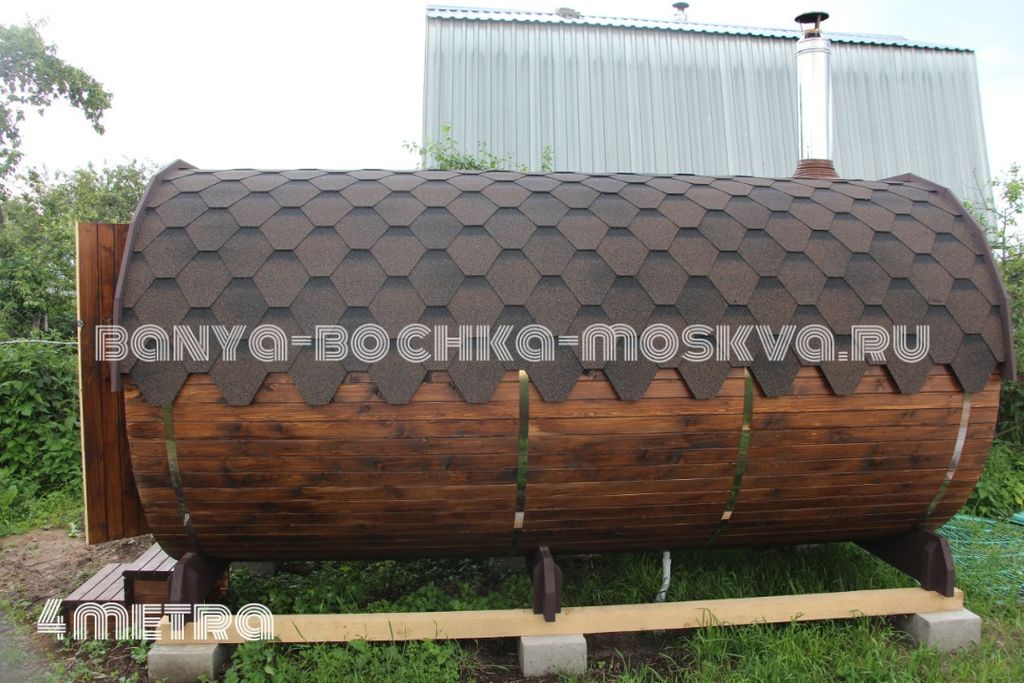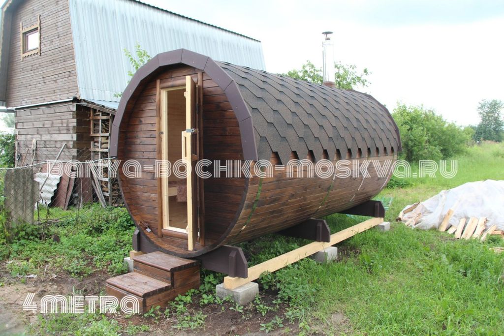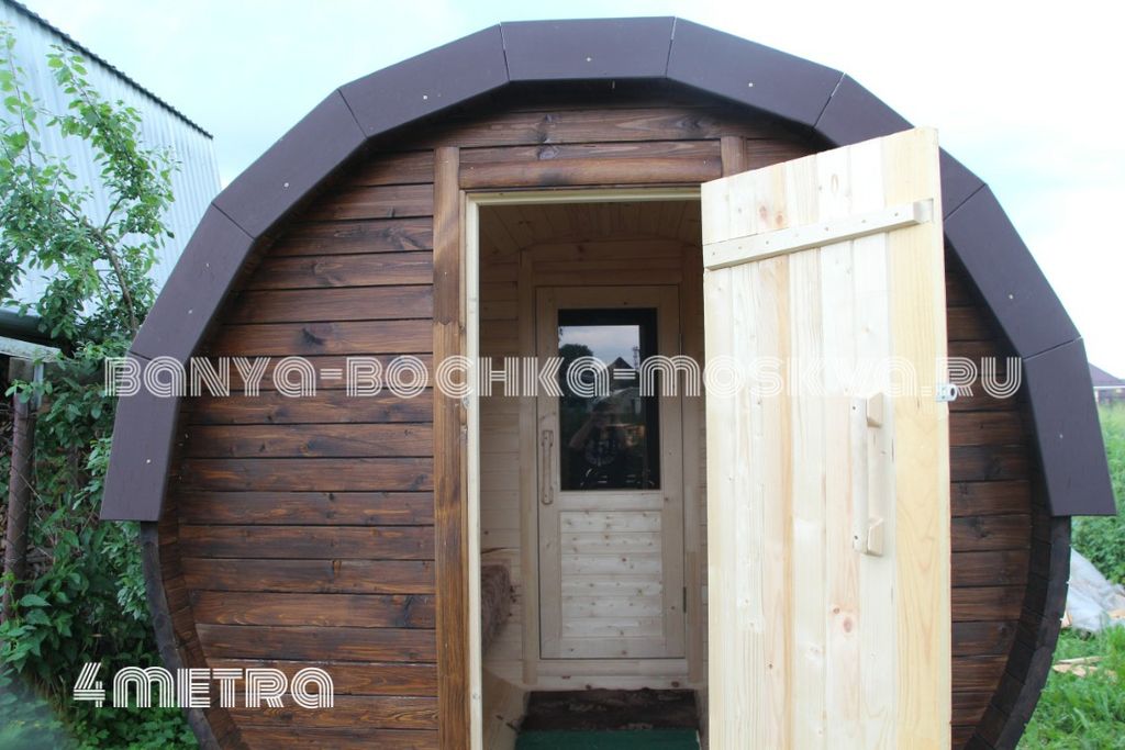 - Баня-бочка 4 метра— лидер продаж по соотношению: цена-удобство, так как имеет одинаковые размеры предбанника и парного отделения.